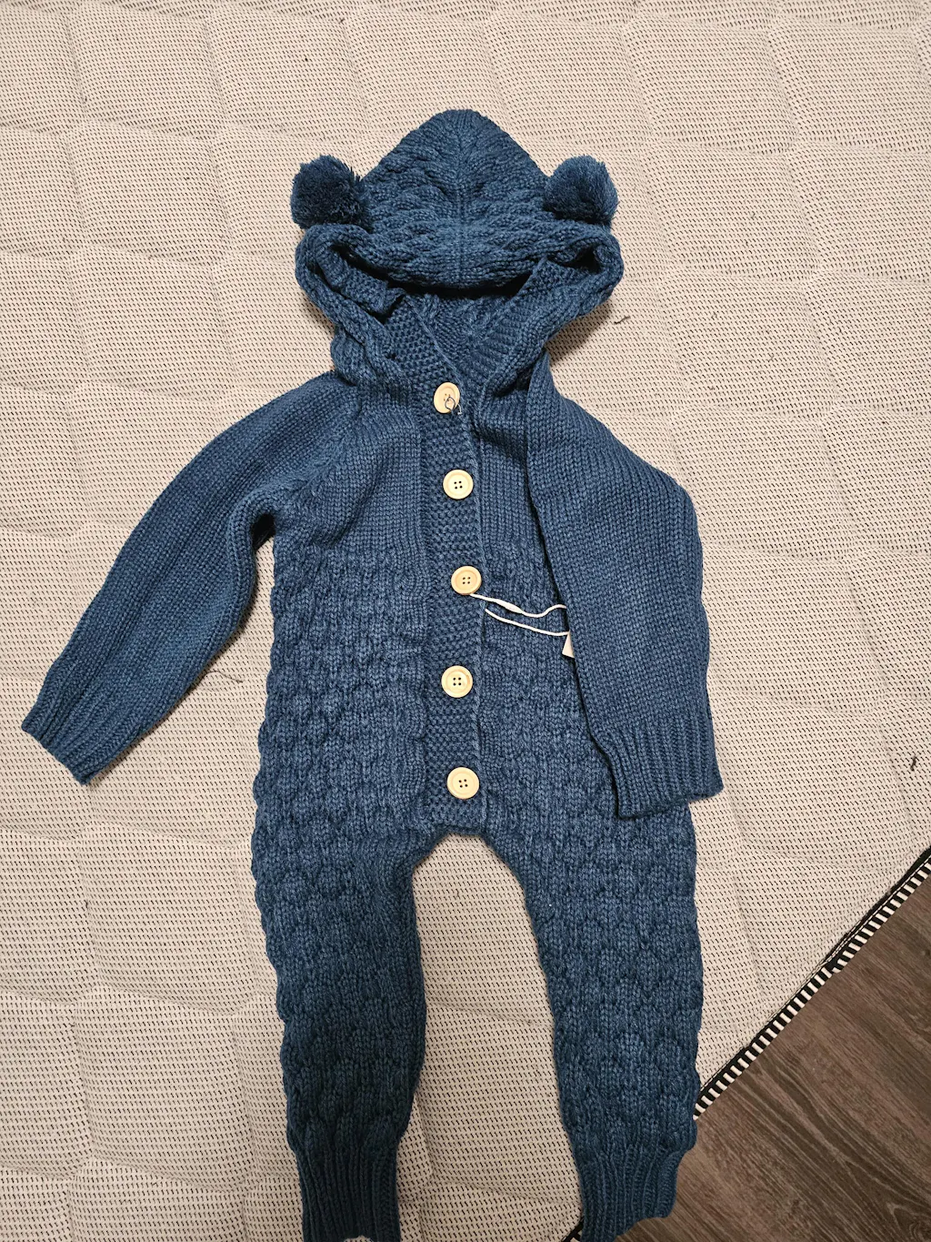 Made with space to cuff the arms and legs you can style it your way, and it can be worn over babies clothing to be extra warm. Pom Pom ears give the suit a fun and fashionable edge. The Bear Knit Onesie is made unisex for boys and girls alike.