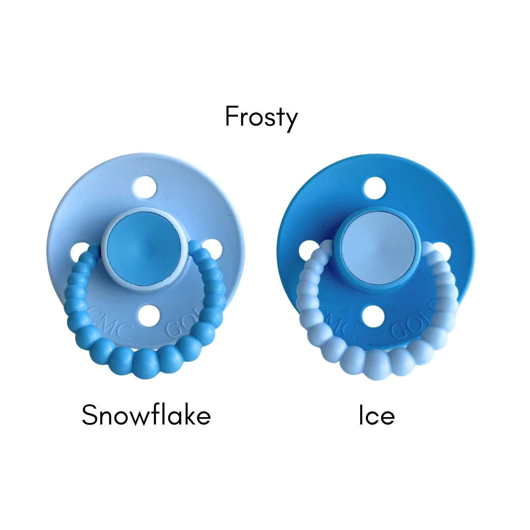 CMC Gold dummies come with an air filled teat, which means air or water won't flow in or out of the teat. Our teats are generally a little bit shorter than most teats out there but have a bigger ball on top to better help bub latch onto when soothing.
